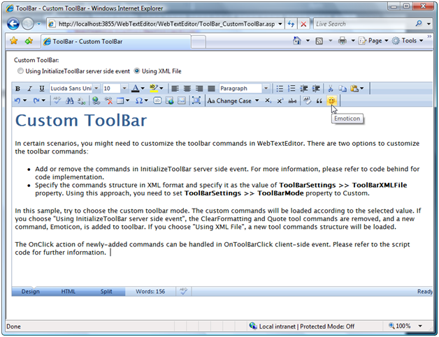 <WebTextEditorToolCommand Name="cmdEmot" Type="ToggleButton" Text="Emot" DisplayMode="Image" Image="smiley.gif">