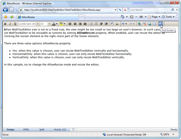 To enable Full Screen in WebTextEditor